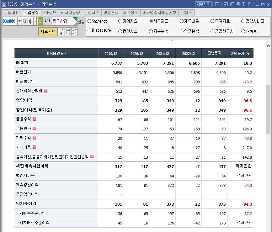 동국산업의 실적은 23년도 1분기 실적이 공개되지 않아서 22년의 결과를 보면 공개된 실적은 크게 개선되지는 않았습니다.