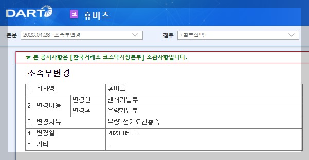 휴비츠의 소속부가 변경되었습니다. 기존 벤처기업부에서 우량기업부로 변경하였고 우량 정기 요건을 충족하였다고 합니다. 이렇게 소속부가 우량기업부로 변경된다는 사실이 휴비츠라는 회사가 실속 있게 잘 성장하고 있다는 걸 증명하는 것 같습니다.